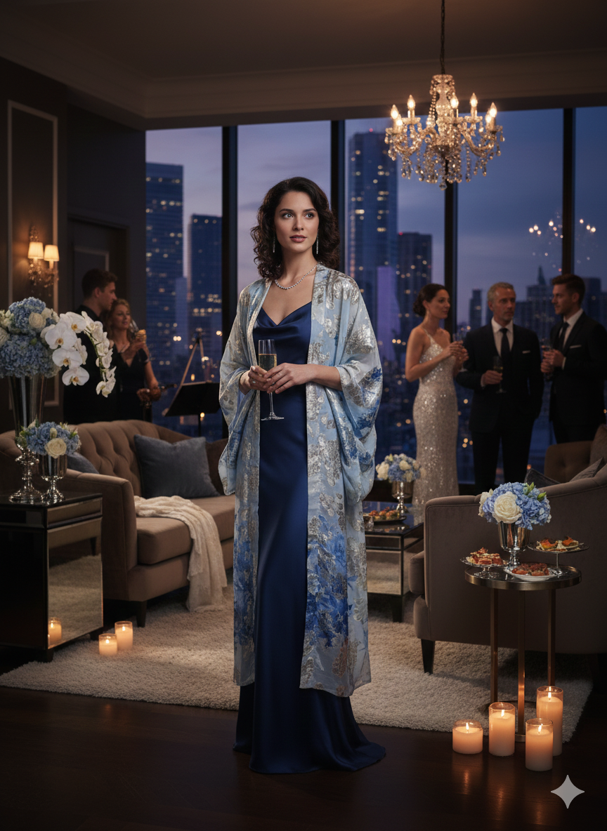 Coupe et Style : Sa coupe fluide et aérienne, typique de l'abaya ou du kimono d'intérieur chic, permet un mouvement élégant. Porté ouvert sur une tenue unie (comme ici, le bleu poudré) ou fermé, il devient immédiatement la pièce maîtresse de toute garde-robe de luxe.