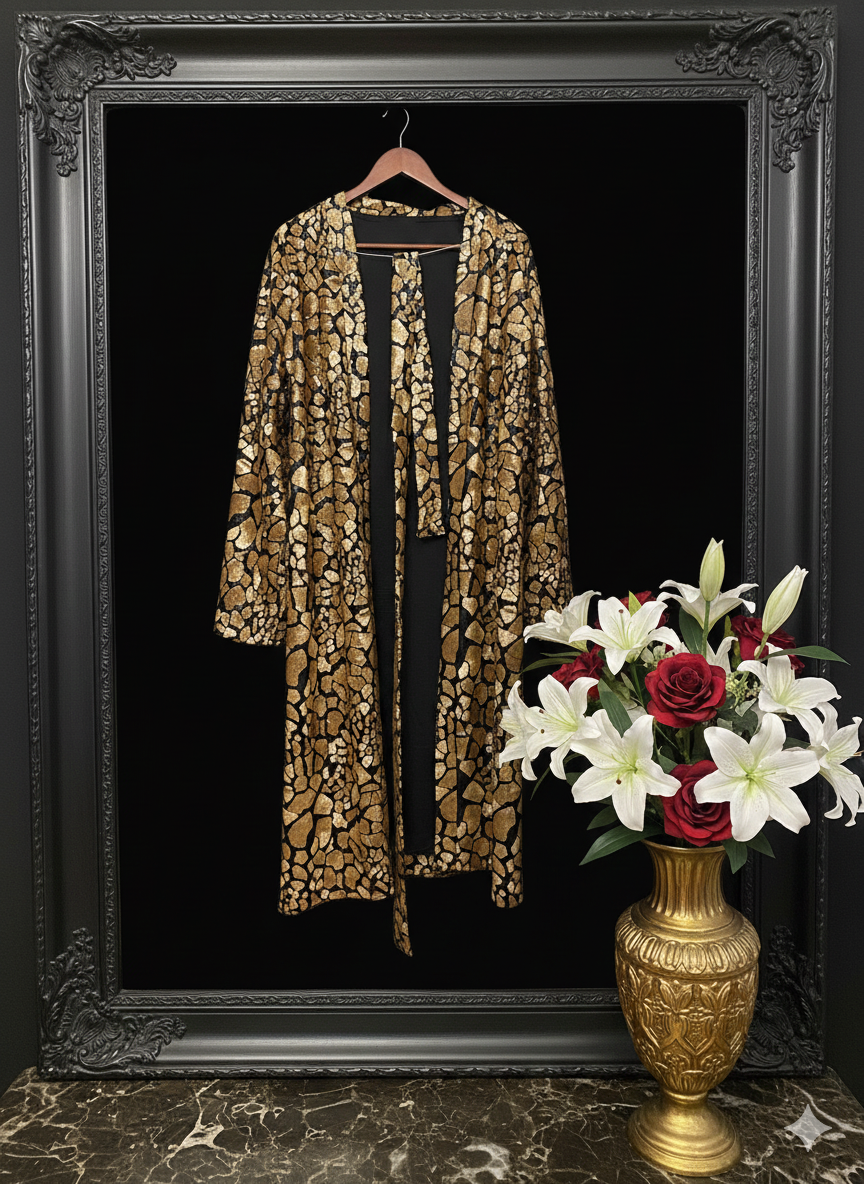 Ce kimono d’exception incarne le raffinement et le luxe à l’état pur. Conçu pour les femmes en quête d’une pièce unique, il allie la douceur absolue du satin de soie à l’intérieur à l’éclat somptueux des sequins dorés à l’extérieur. Une création pensée pour briller avec élégance, sans compromis sur le confort.